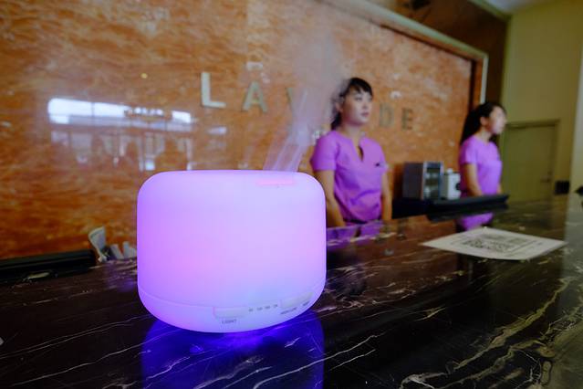 酒店的前台,紫色薰衣草香薰精油加湿器带来香气满屋。