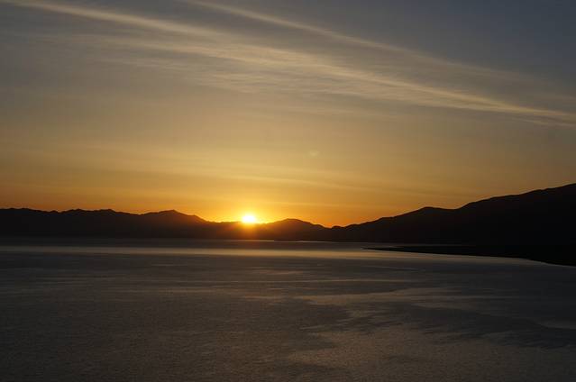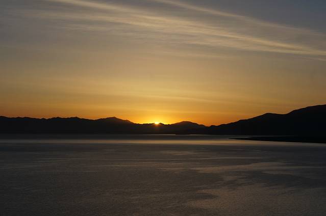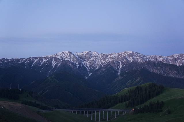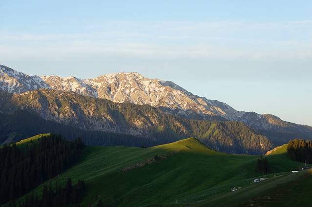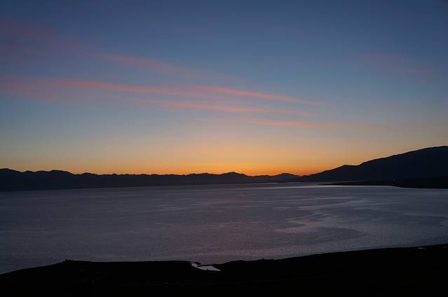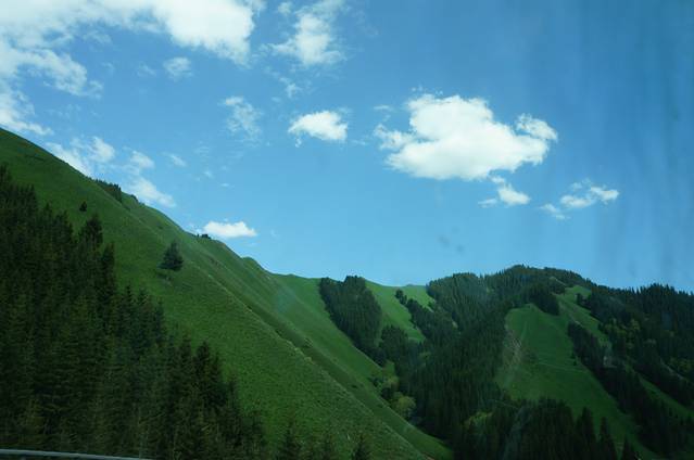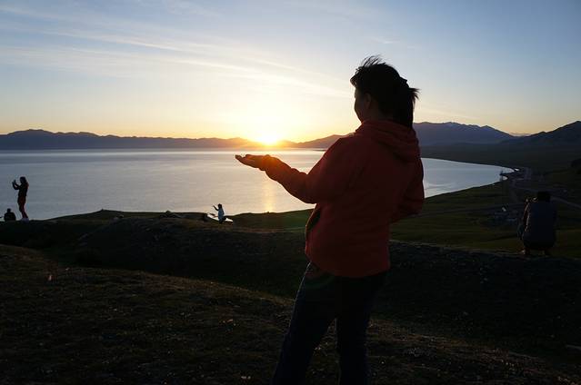 前一夜是睡在了蒙古包里,人多,睡眠质量有些不好。第二天起床,上山去看日出。6:55分日出,下面的照片拍的就是日出,太阳出来的瞬间很美。山顶上的风还是很凉的,吹的人有些寒冷。看完日出,自己用过早餐后,向景区里面出发,今天刚好是赛里木湖一年一度的环湖自行车赛的比赛,比较幸运参与到了其中。在景区内可以做车游览,也可以选择漫步。我们的车车走走停停,照了一路。