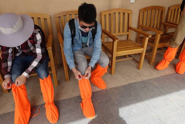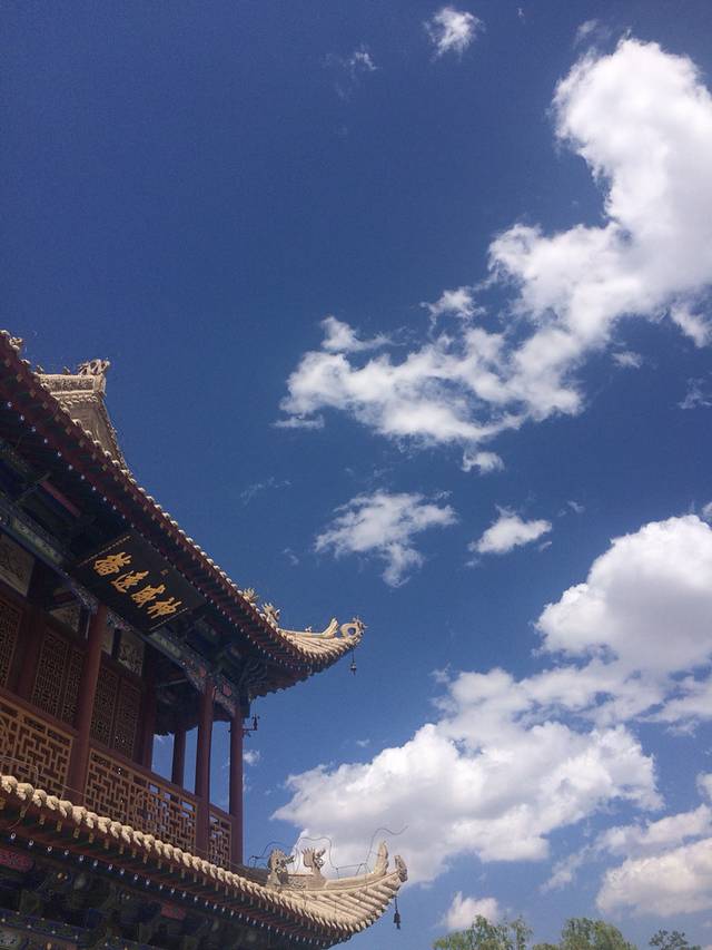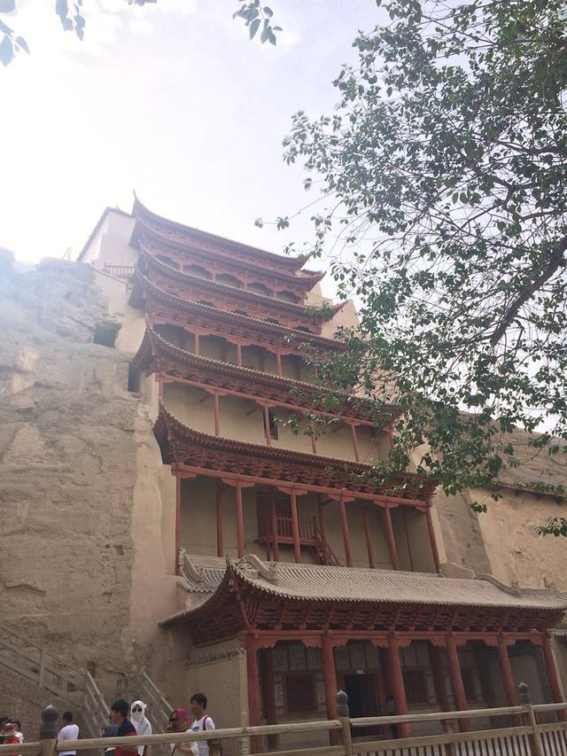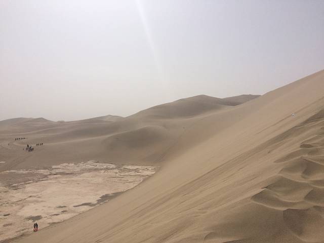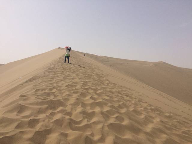 原本以为鸣沙山在一片沙漠中,没想到从我们住的小时代青年旅社走过去,在路上就能看到不远处的沙山,那就是传说中的鸣沙山了。鸣沙山,第一次听说是在余秋雨的文化苦旅里。百闻不如一见,出现在我眼前的鸣沙山,比我在小说里看到的更美,更令人震撼。一般建议上午早一点去鸣沙山,这样可以玩久一点,也不会那么热,中午我们回去的时候景区里基本没人了。下午的话风沙有时候会很大。为了防沙,我们租了荧光橙色的鞋套,真是大煞风景。景区里还有骑骆驼、滑翔伞、直升机等游乐项目,但这次大家没什么兴趣玩(因为穷),所以就直接走去了月牙泉。我则兴冲冲地沿着沙山的山脊往上爬,却发现越爬越累,只能下山了。。建议大家爬的时候踩着前人留下的脚印走,会比较省力,而且千万不能企图冲上去!!保存体力啊同志们,我下山时都想滚下去了😂😂之后在景区外面一家店吃了驴肉黄面,是这边的特色,只要28元,驴肉一盘,面一盘,很好吃。