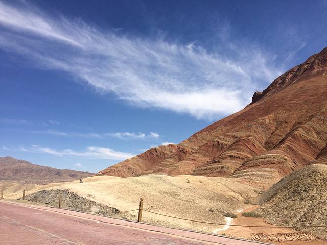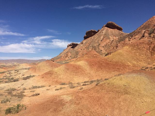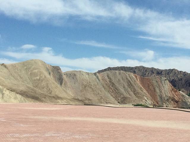 早上七点半从张掖市区出发,一小时到达张掖丹霞国家地质公园。门票40,学生票20,还要加上观光车票20。如果人多可以包车,10人一车300元两小时。进入景区看到的还只是土黄色的丹霞,让人有点小失望又有些期待,到底真正的七彩丹霞是什么样。观光车会在四个点停车,每个点都有两三个景点可以参观。