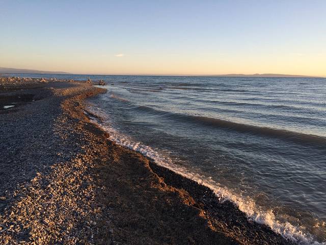 五点半起床,随便洗漱下,穿上最厚的装备就出门了。客栈里有军大衣租,10元一件,够早上2到3度下保暖的了。走出门就见到朝霞,再走到湖边,太阳正好露出了脸,光芒万丈!湖面这时也呈现出波光粼粼的模样。庆幸今天是个大晴天,让我能看见青海湖的这一面,美不胜收!