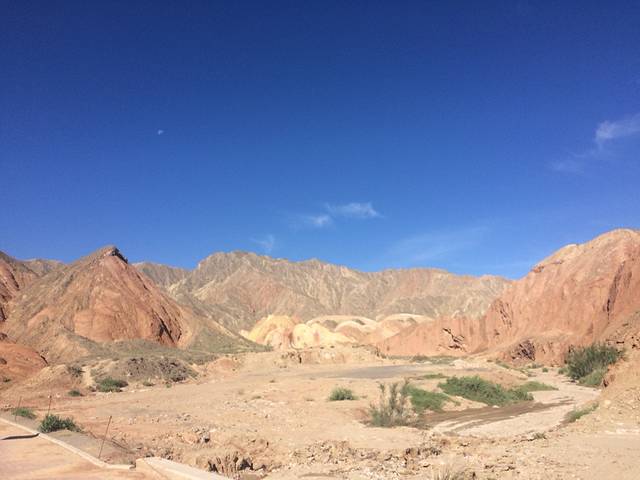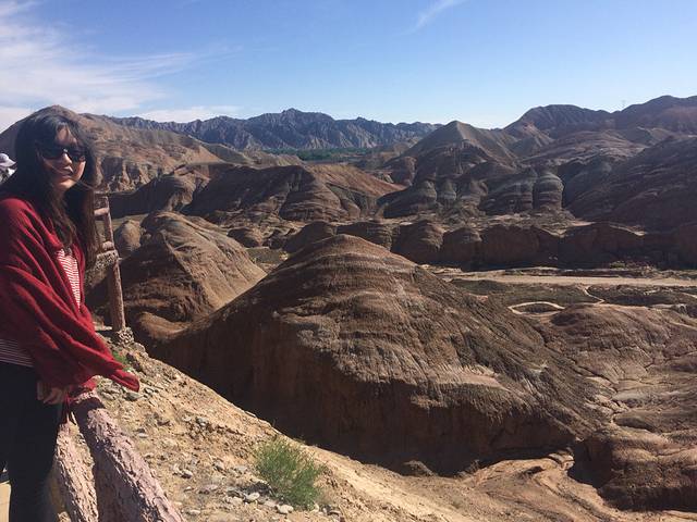 在第一个点,丹霞呈现着黄绿白灰色,也没有很惊艳。第二个点才让我慢慢有色彩斑斓的感觉。卧在群山中的“睡美人”,戴着头纱,微合双眼,双手似乎交握于身前,无比安详。再从吊桥走过去,爬上高高的阶梯,尽管爬的气喘吁吁,丹霞山群的景色一览无余时,还是感到心满意足的。其中有一个盆状的山,两侧有较低的开口,各种颜色缠绕着它的外侧,里面却看不清楚,让我很想走近它一探究竟。