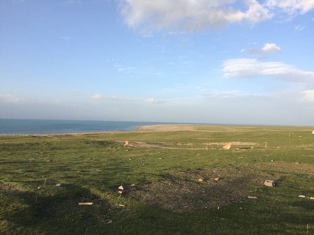 晚饭在黑马河镇上的一家清真西宁特色小吃店吃的,大盘鸡、土豆烧牛肉、手撕羊肉这些特色菜的确味道很好,特别是土豆。我们大快朵颐,把每盘都扫荡一空。这时候已经七点多了,天还亮堂堂的,风沙特别大。回到客栈,我们一下车就扑向了青海湖旁。大片灿绿的草地,斑斓的湖水,除了沉醉其中,我找不到其他方式面对这大自然慷慨的赠与。但是这时风还是特别大,我们拍了很多照之后赶紧回去了。