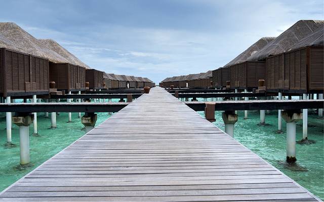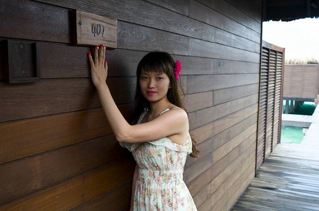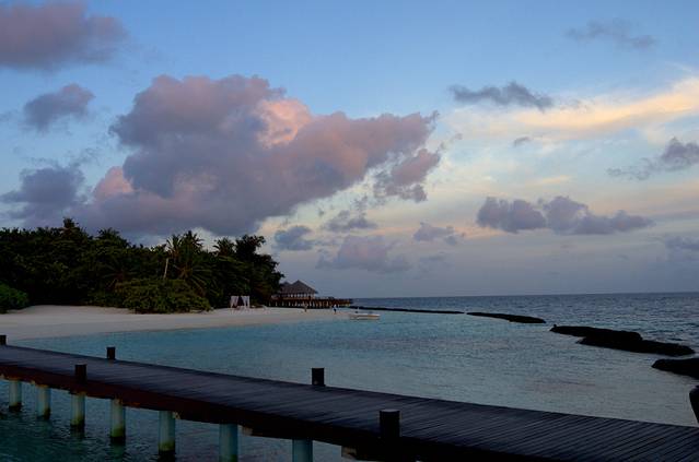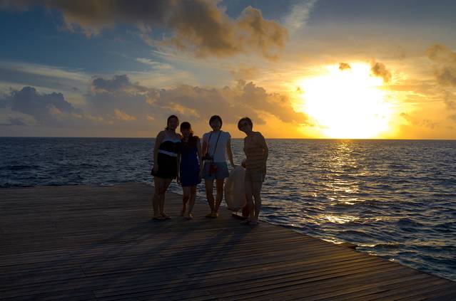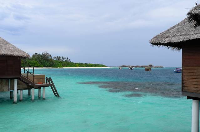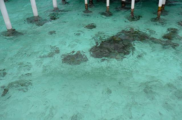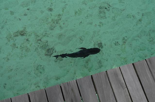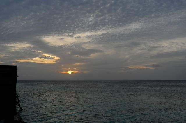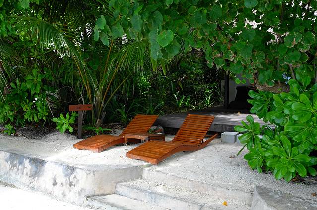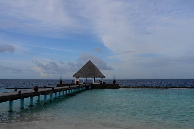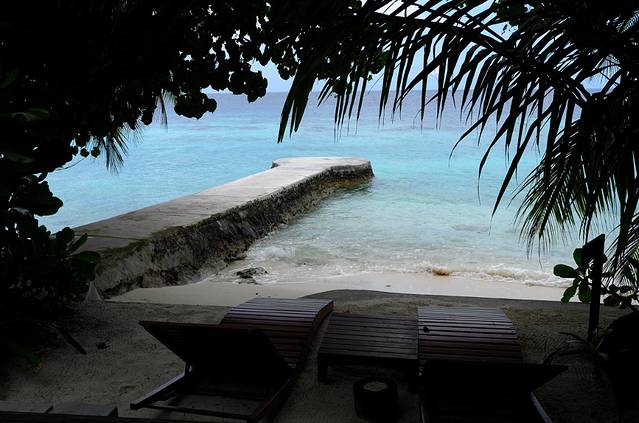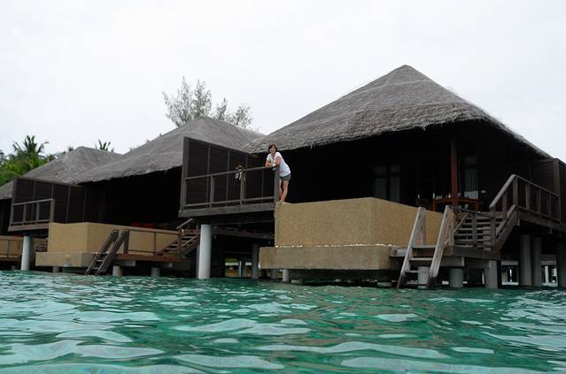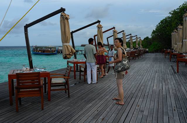 我们住的是307和309,可以看到日出。每两个房间门口出去都有一个这样的,可以伸到水里,这是我们这边沙屋的特色,另外一侧的沙屋出门就是沙滩,不过很多都安排给了欧洲人。