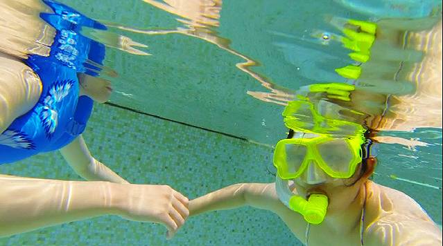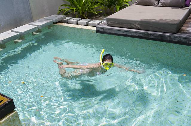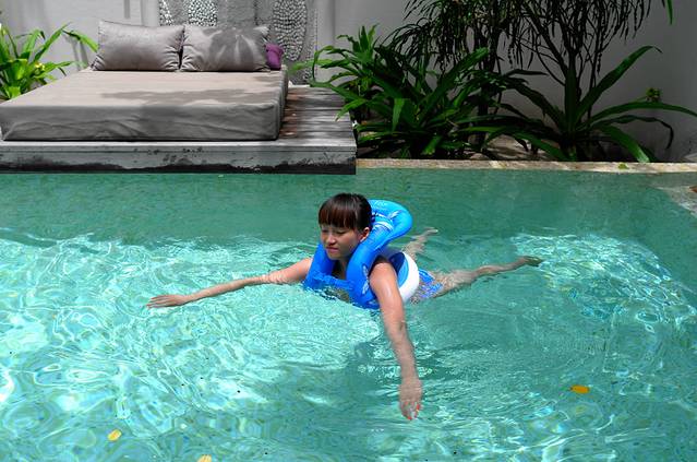 好热,回去就在游泳池里扑腾开了。 我们两人都不会游泳。还好我带了个充气游泳圈。