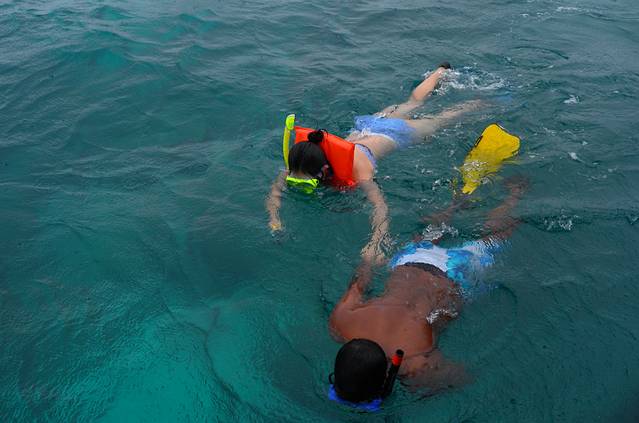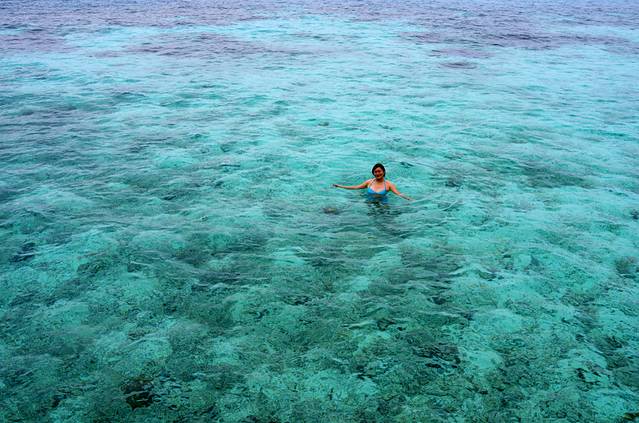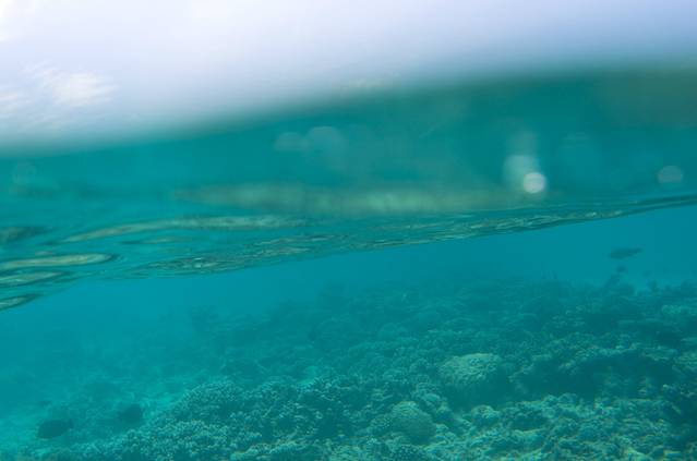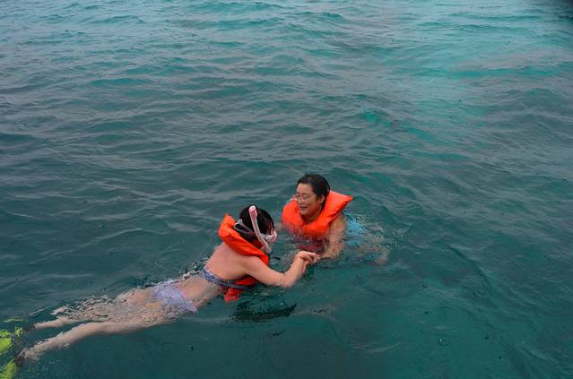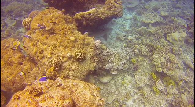 游了没多久,想着这里浮潜还不错,于是带上面罩和呼吸管游到珊瑚丛那里去看鱼了。