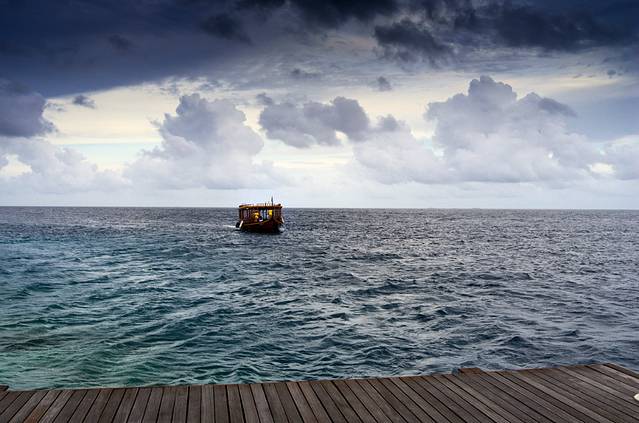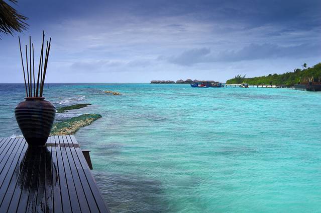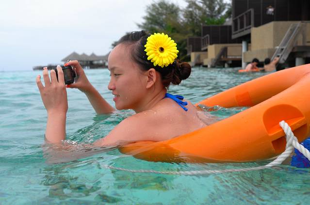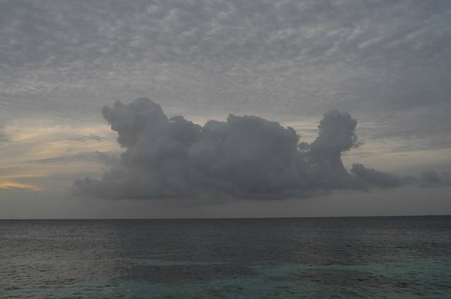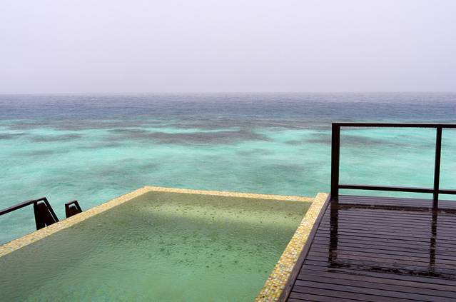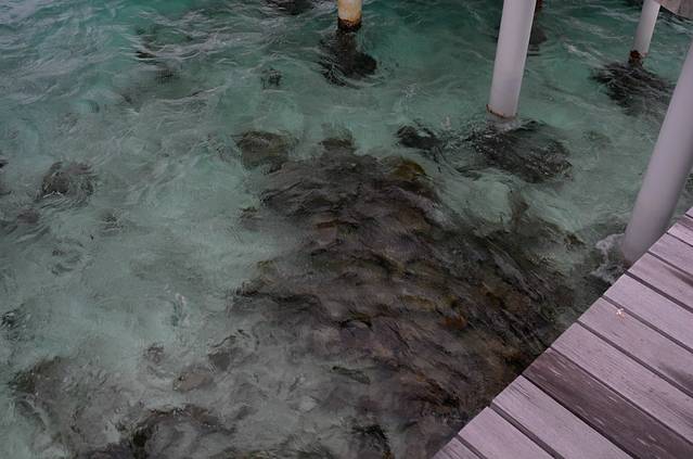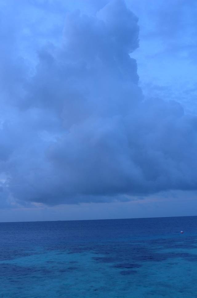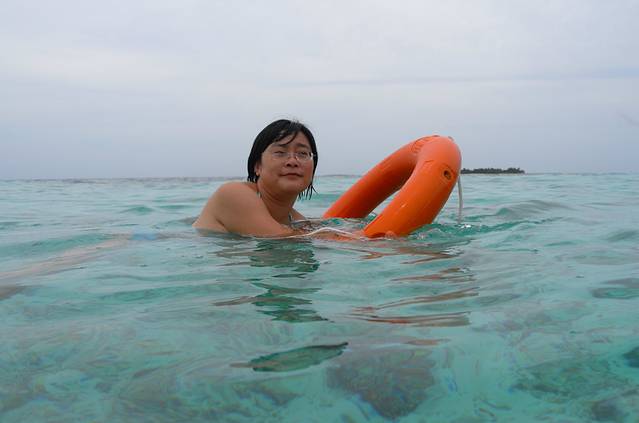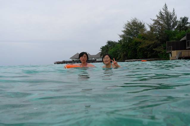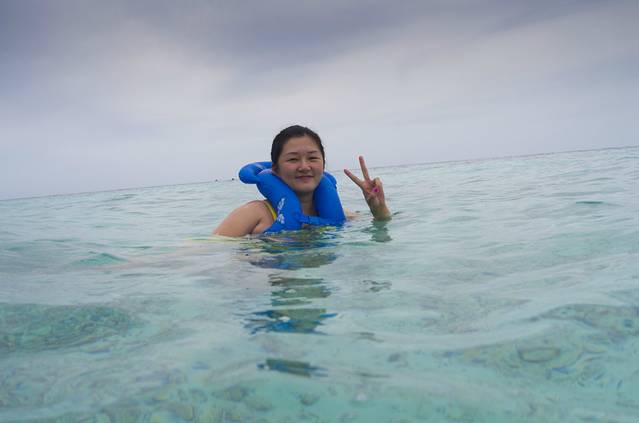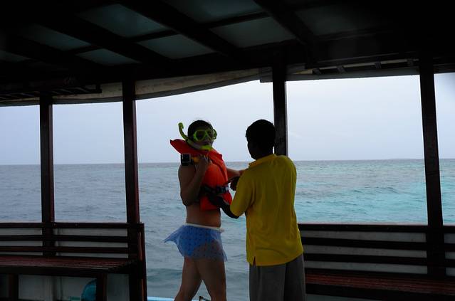 这个时候,天慢慢开始阴了,一大朵乌云飘了过来。 我们是定的今天上午10:00-12:00浮潜,但是现在风和浪慢慢的变大了。一会居然下起了瓢泼大雨,我们只能被困到房间里,哪里也去不成。我们本来都已经穿好比基尼了,只能回房间看电视等。 管家说11点如果能去就给我们电话。 当时真的好失落。。。11点的时候管家来了,叫我们去浮潜,但是外面还下着大雨,我们好担心这个天气会不会有危险。管家说不用怕,木有影响。 于是我们冒着大雨,在别人奇怪的眼光下登船出海浮潜了。