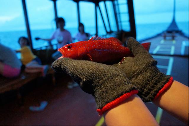 这条小鱼浑身通红,布满了白色小点。看了一下目录原来叫番茄鱼,很可爱的名字哦。 第一条鱼钓上来果然又刺激了大家继续激情。因为这条鱼还是小鱼,因此就把它丢回了海里。顺便说一下小黑弟弟以前就是做渔夫的,有三年的经验哦。