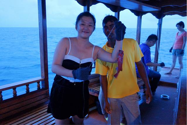 在岛上我发现工作人员最熟悉的中文居然是浮潜和珊瑚。 理由在开始钓鱼没有多久我就明白了。 我旁边的MM第一个钓到了东西,小黑很熟练的去扯了一下线,直接说了句,珊瑚。后面也有人陆续钩到珊瑚,一个比一个大,但是都没有人钓到鱼。 穿饵的这个小黑弟弟帮我钓了一下,一会就钓起来一条好漂亮的小鱼。