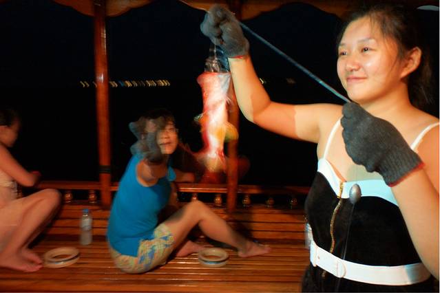多尼船一直把我们带到两个岛的中间海域,然后停了下来。 小黑给大家一人发了一个线圈,简单教了下大家怎么钓鱼,于是各自就开始了。