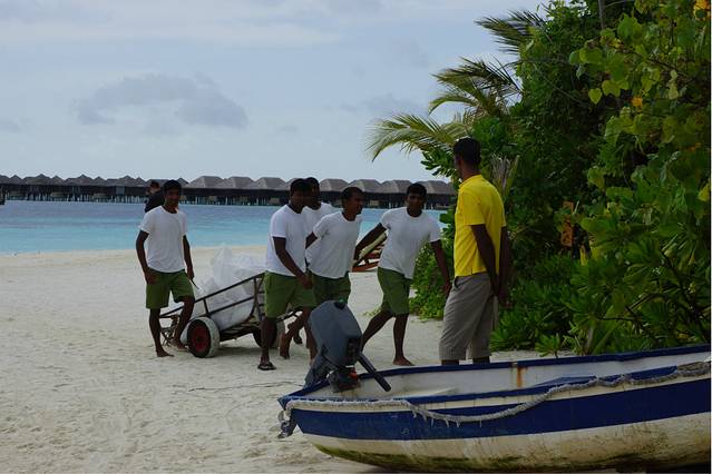 小黑们在将垃圾运上船带离岛。为了环保,还是建议大家少用纸巾,都用餐巾和毛巾,减少丢垃圾。岛上一切物资都靠船运,垃圾也是如此运出去。