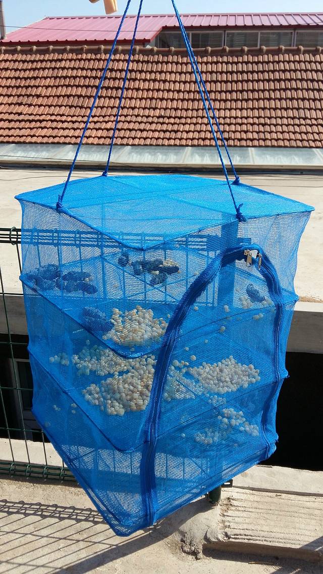 渔家自己晒海货的小笼子,很可爱吧,正在晒扇贝柱