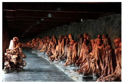 这是罗汉长廊,一路过去全都是根雕罗汉。到底有多少罗汉那我肯定是数不清的,我儿子也试了数一些,数到100多的时候他说:他多了,数不过来了!可见这里的罗汉数量确实多,而且雕刻的都惟妙惟肖。