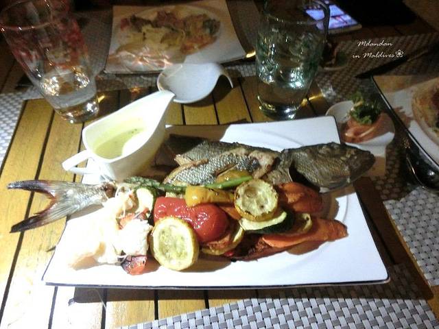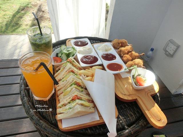 现在给大家说一下JV,JV岛我们去的时候中国人比较少,大多是韩国人、日本人和欧美人,她们的穿衣风格特别的简单,简单的T、简单的短裤和短裙,或者就是比基尼外面套一个透明的罩衫,都是特别的随意,上岛以后会让你压800美元,岛上这几天的消费都是从这里扣除的。JV岛每个房间都有一个私人管家,岛上有一个中国管家,我们特别巧就遇上了中国管家,真是太方便了,而且服务也是相当的好。岛上有三个餐厅,一个是主餐厅,一个是BBQ烧烤餐厅,一个是西餐厅,代理包的早晚餐都是在主餐厅,主餐厅有中国服务员,超级亲和!在主餐厅早餐吃任何东西还有喝的饮料酒水都是免费的,全是包在你定好的费用里,晚餐也是免费,但是喝的单点的是要付钱的,如果你要吃其他两个餐厅,必须提前一天和你的管家预定,我们去吃了BBQ,真的很好吃,尤其是那个双人份的烧烤大餐,真的分量很足,人家老外都是一家人在吃一份,我们两个人在吃了开胃菜,主菜主食之后吃下了这个烧烤大餐,真的太爽了,哈哈哈哈。后就吃了200美元就这样,很贵!西餐厅的消费更加的贵,所以在经济充足的情况下可以去尝尝,哦对了,主餐厅每天都有不同的主题,譬如什么亚洲风啊,烧烤风啊,东南亚风之类的,都是自助的形式,也可以单独点,但是自助的比较划算,你可以把你的钱全部吃回来哈哈,我们就是一顿狂吃!不得不说味道真的很赞!!!岛上每个人都非常的热情,不管是不是工作人员,见面都会给你打招呼,你也要很热情的去回应!JV岛还拥有一个获得国际专业潜水教练协会(PADI)认证的潜水中心,大家可从事各种潜水活动,欣赏这里闻名于世丰富多的鱼类和海龟。大家还可享受多种水上娱乐项目,包括泛舟、皮划艇、帆船、滑水、帆板及风筝冲浪、深海垂钓以及私人包船。我们去深海垂钓了,潜水都是自己淘宝买的装备自己下海去潜,只需要去租个脚蹼就OK啦,岛上还有一个健身房,如果有健身需求的可以带好你的装备。说了这么多,有点唠叨,有些补充的会在下面继续的,现在就说说要注意带的东西吧!