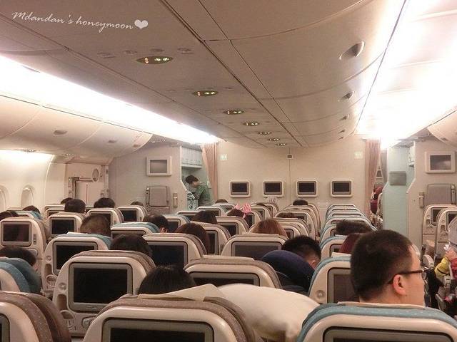 飞机超级大的,飞机上基本上都是蜜月夫妻,人太多了,感觉麻袋不要钱一样,哈哈,淘宝代理订的座位是分开的,导致我们所有人都在换座位,太麻烦了,所以之前一定要和代理说清楚,在座位在一起。