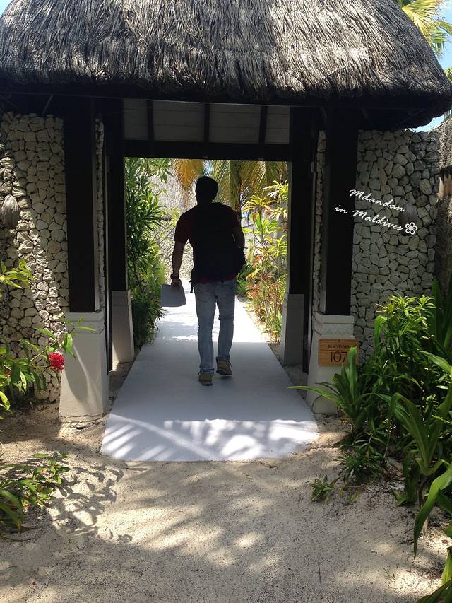 这就是我们的沙屋了。107号房,大家再订酒店的时候要提前告诉她们要求住比较靠前的沙屋,因为岛上有个柴油发电机,所有岛上的电,都是从那发出来的,柴油味比较重,所以住比较靠前的沙屋比较好,我们住的就闻不到柴油味!