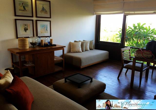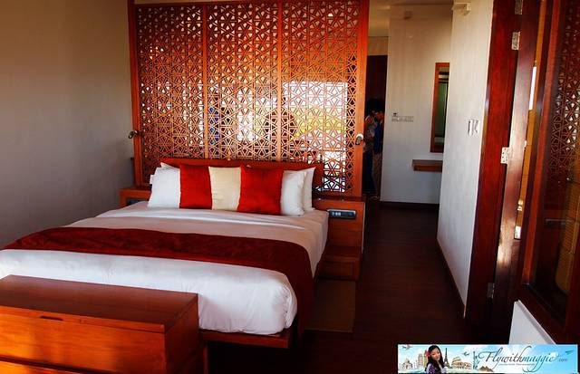 我的房间是二楼的豪华套间,装修的格调很高雅,空间非常大, 整个房间散发着淡淡的木香,融入了现代化的设施, 但房价并不昂贵,因为这是一家全新的度假酒店。房间的厅里,有一扇凸窗,透过窗就能看到湖景,卧室则正对着宝蓝色的大海,从阳台望出去是巨大的泳池。