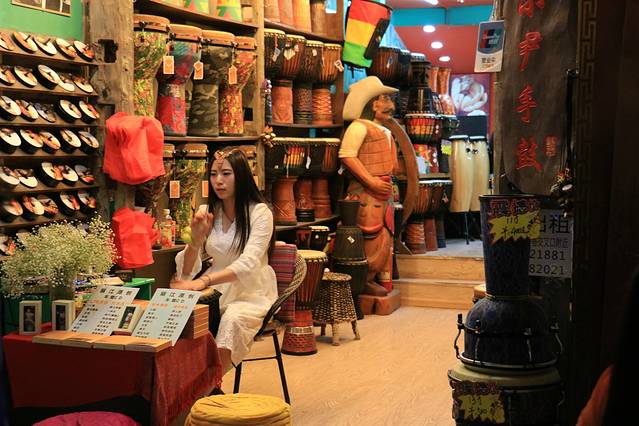 古城里随处可见的东巴手鼓店,戴上特色民族头饰的美女伴随音乐现场(听最多就是那首丽江小倩的《一瞬间》)敲打节拍,这也是古城的一道美景