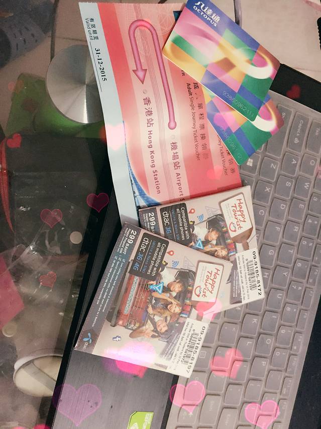 5happy卡和香港卡要提前买 因为下飞机要练习接机的 下飞机就要插卡 香港八达通我当时买了其实用不到 如果在香港待时间久的话 经常坐地铁可以买一个。飞机快线也买一个 不过要看酒店有大巴直达吗 我这次住的尖沙咀 当时没看就直接买的机场快线 其实有大巴的。