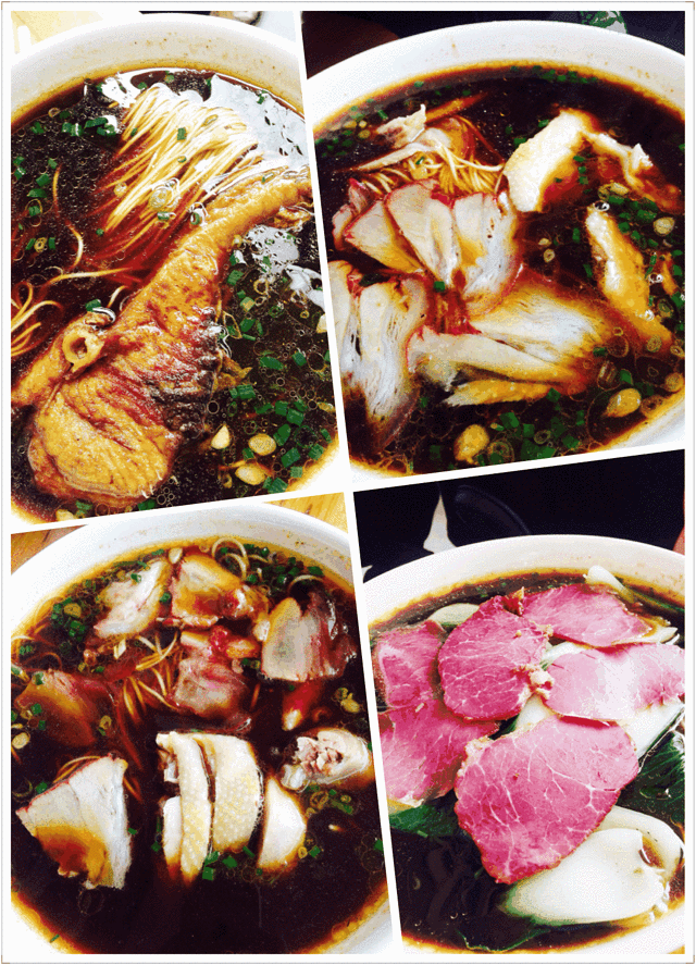 依次是猪排面、万三面、奥灶面、加了肉和青菜的阳春面,
