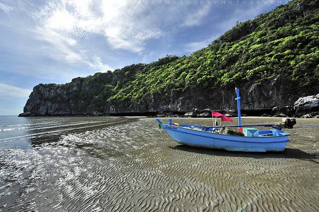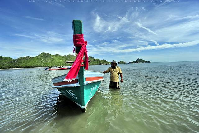 从曼谷拥挤肮脏的小巴站,花180泰铢买了前往华欣的车票,但是因为遇上周末,排队乘坐小巴的人暴涨,我们被排到了下午出发的车。路上又花了3个多小时时间,直到夜色降临才到达华欣,在我眼里,华欣就像是一个乡村小镇。拖着行李,按照手机导航指引,找到了预订的酒店,这是一家类似县城招待所一般条件的客栈,要价2000泰铢,不过,经过一路奔波,这家还满干净的客栈,让我们已经很知足了。第二天一早,请客栈老板帮忙联系约好的包车,准时来接我们去码头。原来,想去看那个传说中的山洞,还得车船辗转,光到码头的路,又花去了一个多小时时间,这才到达有着一大片沙滩的码头。