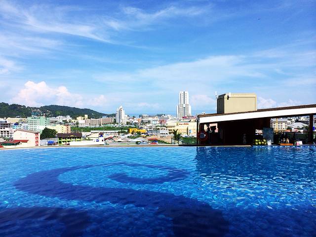 我们第一站行程就是kata海滩,从机场到kata开了大约一个小时,真素没想到这么远啊,不过就当是看风景了,话说泰国人民相当的友好,司机师傅把我们送到酒店,是又帮我们抬箱子,又帮我们check in 的,弄得我们都不好意思了,身上也没有泰铢的零钱,所以只能一个劲的说thank you,酒店前台妹妹也相当热情呀,乌拉乌拉一堆英语,硬是没听懂,她直接在电脑上打出免费给你们升级房间,有这等好事,那必须欣然接受呀,又是一顿thankyou,酒店规定2点才能check in所以登记完把箱子寄存一下就去旁边找了一家饭店解决一下,路边好几家711便利店,再顺便买些饮料回酒店,话说泰国的果汁是又好喝又便宜。。。。。由于折腾了一天所以下午哪也没去就在屋里呼猪头了。。