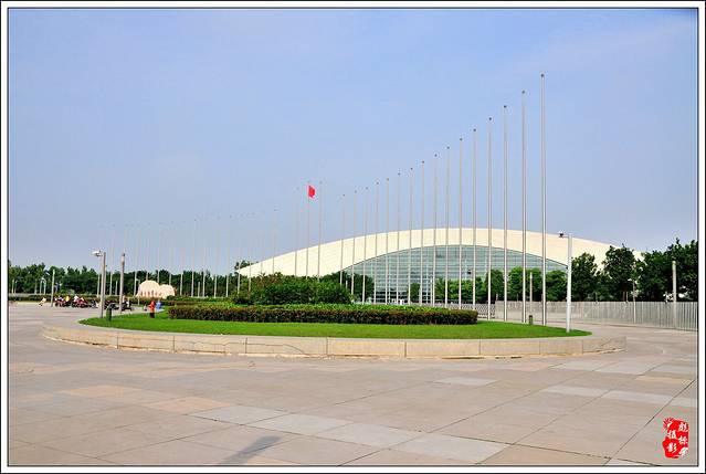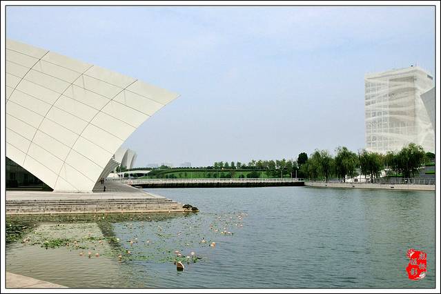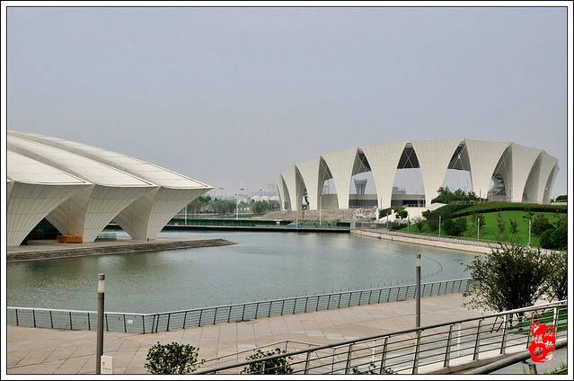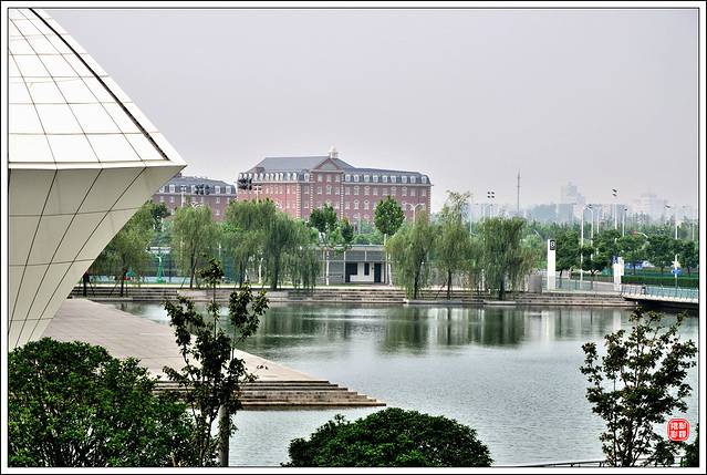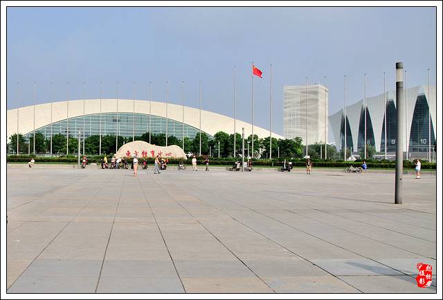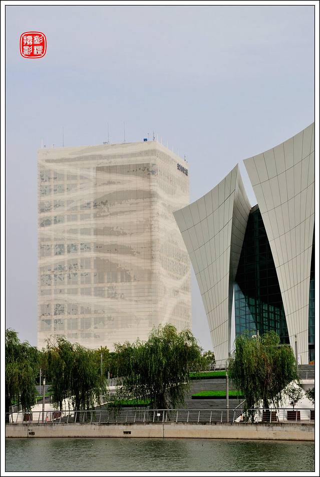东方体育大厦构成,由一泓人造湖水将它们串为一体。