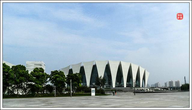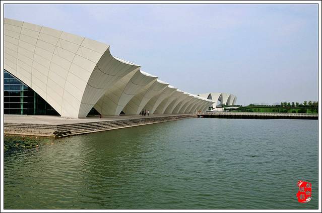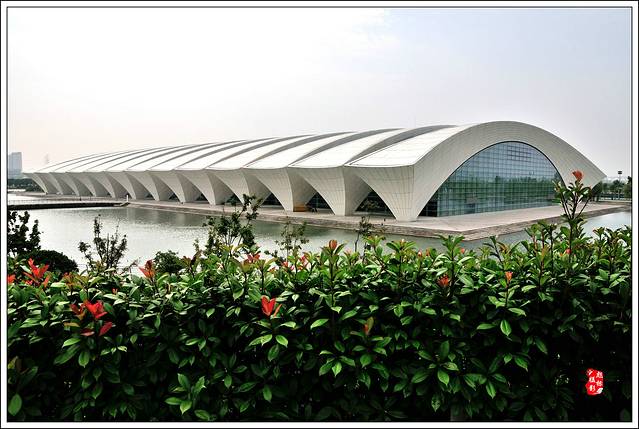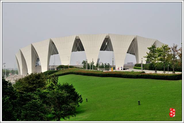 东方体育中心是水上竞技中心,“水”当仁不让成了建筑中的主要元素,体育中心由三座场馆和