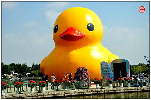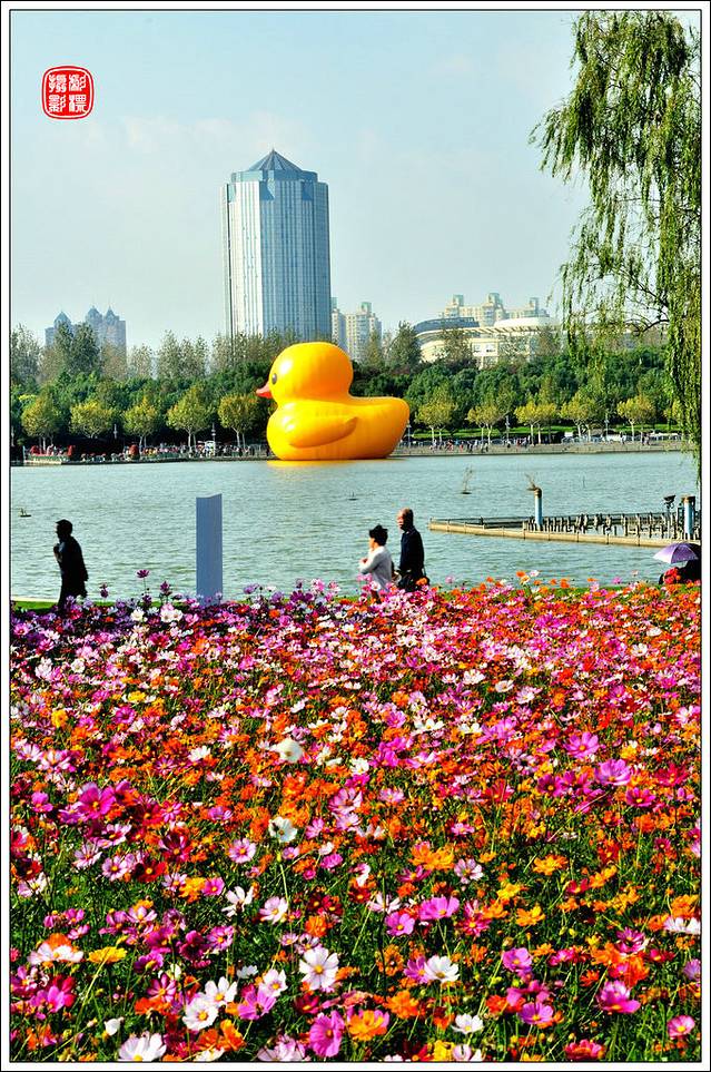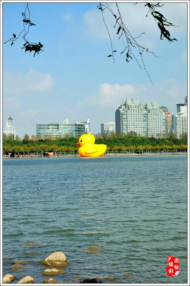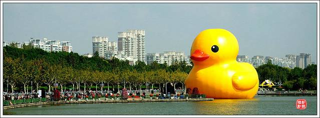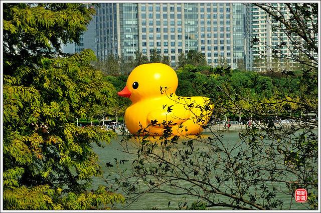 荷兰艺术家弗洛伦泰因·霍夫曼创作的巨型橡皮鸭艺术品—大黄鸭,日前入住上海浦东世纪公园镜天湖。大黄鸭身高18米,宽18米,长25米,体重达到1吨,全身由200片拼成,没有额外支架。