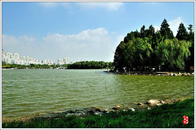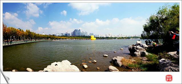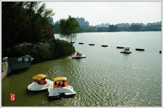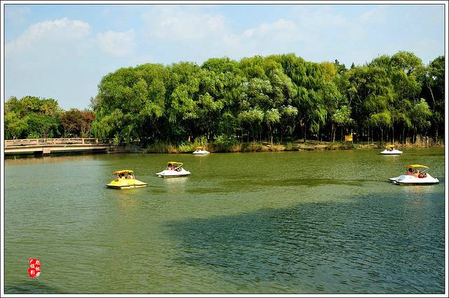 步入世纪公园1号门,映入眼帘的便是面积为12.5公顷的镜天湖。它由人工挖掘而成,最深处达5米,目前是上海地 区面积最大的人工湖泊。