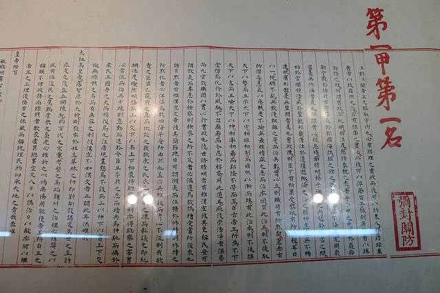 膜拜一下状元卷,字写得好漂亮,难怪唐代大书法家柳公权,颜真卿都是状元出身,漂亮的字加分太多了!以前不知道的是秦桧原来也是状元,而且他也是个书法家,现在的“宋体”其实就是当年的“秦体”。后来他的后代秦大世在清朝乾隆年间还当上了文武双料状元!