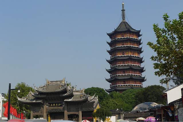一大早起来,吃了汤包和其他苏州小吃,就开始往拙政园进发。路上经过苏州北寺塔,传说是孙权为缅怀他的奶娘所建,塔前有“知恩报恩”的匾额。