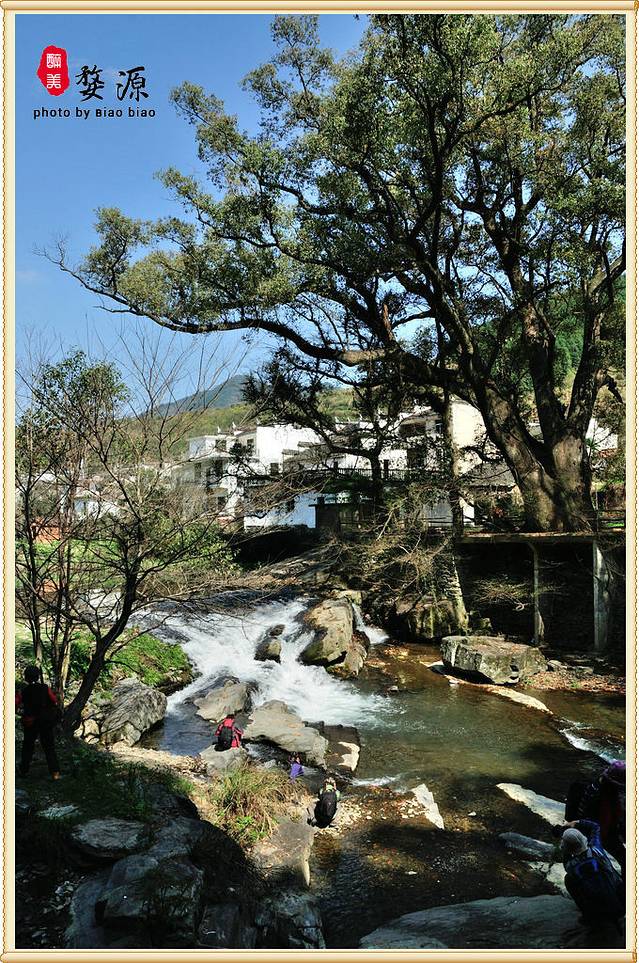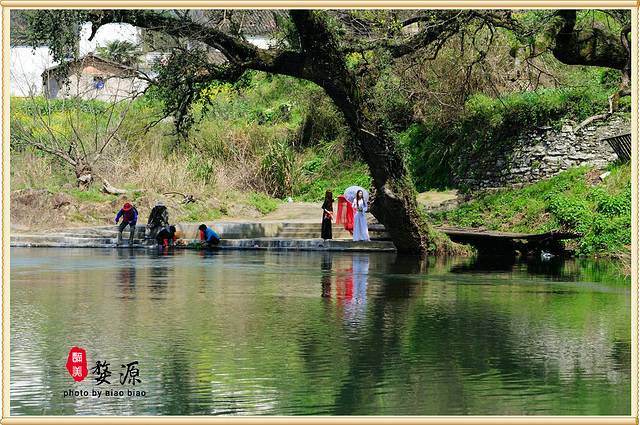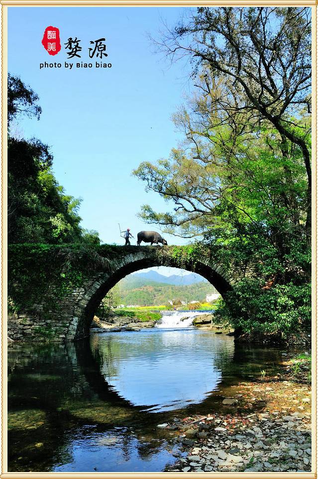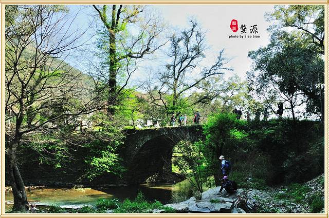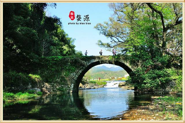 从公路上开始往下走往河边,最先投入眼帘的是由28株粗大、壮实的古樟、古栎、古槠组成的古树群,参天而立,斑驳的树干上交错的虬枝在春风的摧促下绽出了簇簇新枝,洒下了一片绿荫。奇怪的是这些古树全都绕着一座单孔石拱桥而种,当地人取“二十八星宿(秀)拱月”之意,就称该桥为“秀拱桥”。至于为何又称祭酒桥,没有弄明白原因。慢慢走到了河边, 才能发现这座桥的特别之处。察关古桥的建筑年代尚无实考,但据说桥洞却是100%的圆。是的,来到这个角度,可以看到桥下春波轻漾,倒映着桥孔,俨然组成了一个完美的圆,就像圆规画出来的那般工整。透过桥孔远望上游,青山绿水、稻田村庄层次分明,别有洞天。