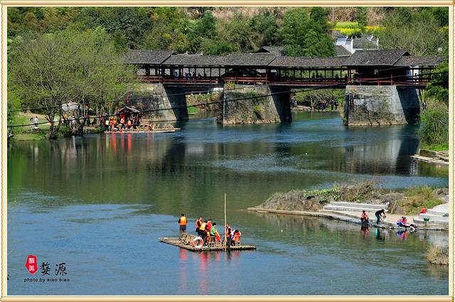 彩虹桥历史悠久,建于南宋,是古徽州最古老、最长的廊桥。被誉为中国最美的廊桥之一。谓之廊桥,就是带顶的桥,适于行人歇息。历经八百年风风雨雨,至今依然完好,显示出古朴与厚重。我们远远地眺望。虹彩桥全长140米,由六亭,五廊构成长廊式人行桥。每墩上建一个亭,墩之间的跨度部分称为廊,因此,也叫廊亭桥。从远处看,亭略高于廊,形成错落有致。彩虹桥取唐诗“两水夹明镜,双桥落彩虹”之意命名。 彩虹桥周围景色优美,青山如黛,碧水澄清,坐在这里稍作休憩,浏览四周风光,会让人深深体验到婺源之美。