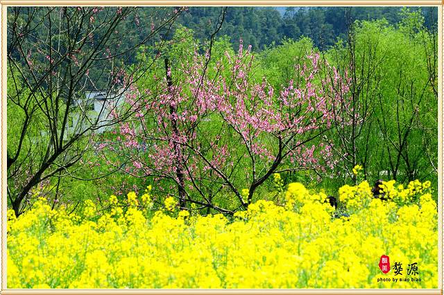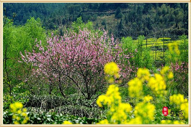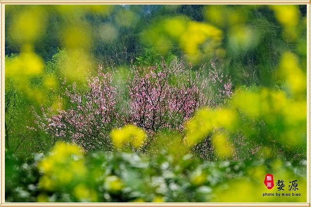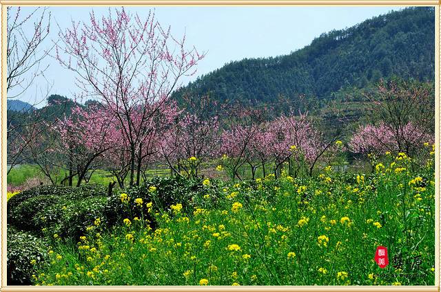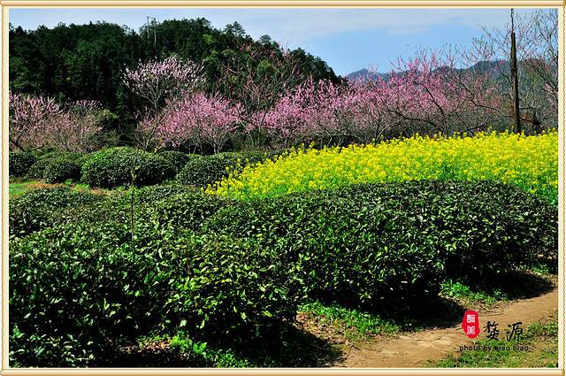 这里是一片桃树和茶地和油菜花,红、黄、绿,非常养眼。