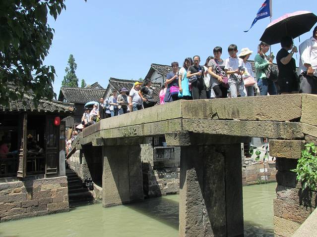第二天我们一觉睡到了12点才起来,然后收拾好还是在民宿对面的那家吃的,因为方便,吃饱了之后老板就开着车送我们去了景区,老板的建议是先逛东栅,因为西栅比东栅大,晚点可以去西栅看夜景,我们听了老板的话先去了东栅。人真的好多好多!!!我们是提前在去哪儿网定的东栅西栅的联票150一张,因为联票比较划算,如果单买东栅是100,西栅是120.没有学生票。既然不远千里来到乌镇还是想把景点都玩了,更何况联票那么划算,肯定果断选择联票了。去了才发现,其实售票处的价格和在网上订的一样,只是网上订的不用排队买票,直接刷二维码或者身份证就可以进去了,这点还是很赞的。