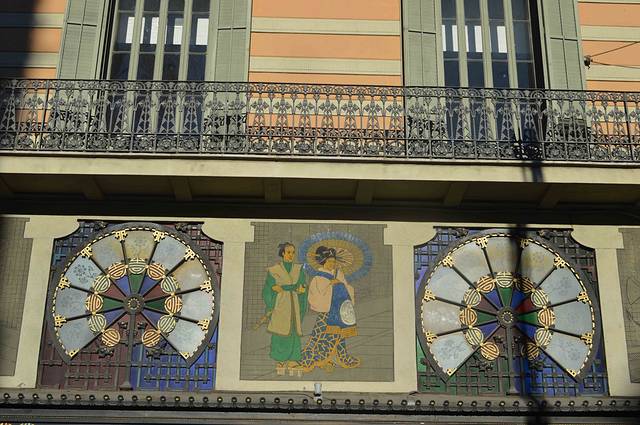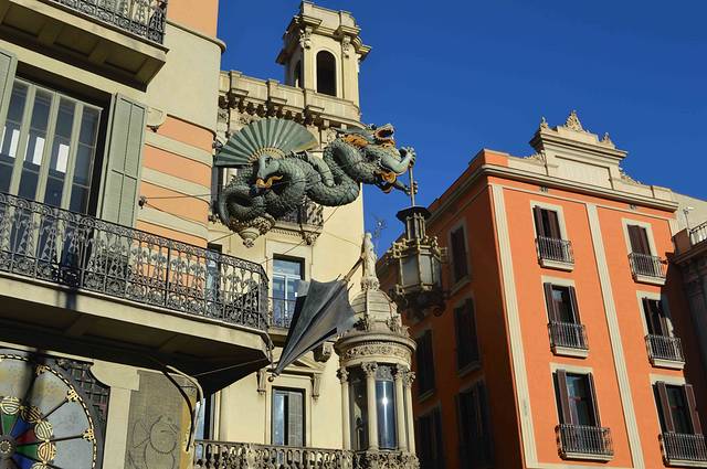 这幢楼正对着我居住的小巷,上面有龙有扇有伞,还有日本人形象,估计是 ATR NOUVEAU - 新艺术流行时期的作品。巴塞罗那新艺术的代表人物是 ANTONI GAUDI 安东尼-高迪。人称巴塞罗那为“高迪之城”。下一篇我会带大家去 一 一 欣赏高迪的作品。今天的计划是逛老城。