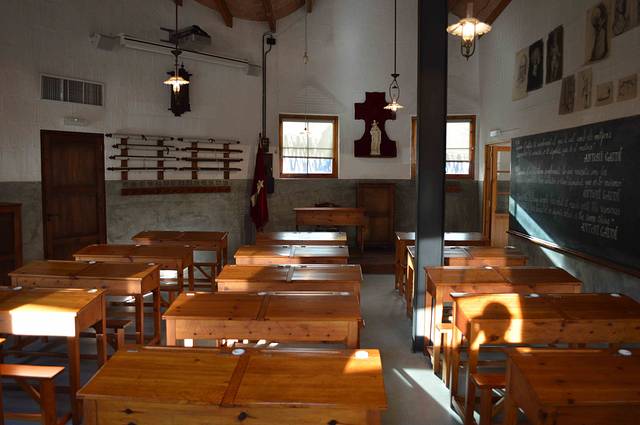 虽然同名“圣家", 但是风格不同。你看不到多少象“圣家堂”般的高大雄伟,学校显得很简朴。 里面依旧被布置成学校模样。看看一百年前巴塞罗纳的学校是咋样的。