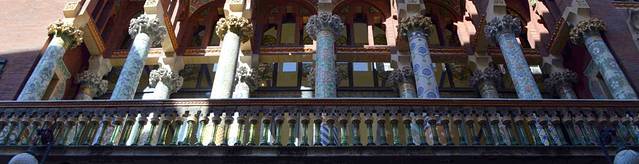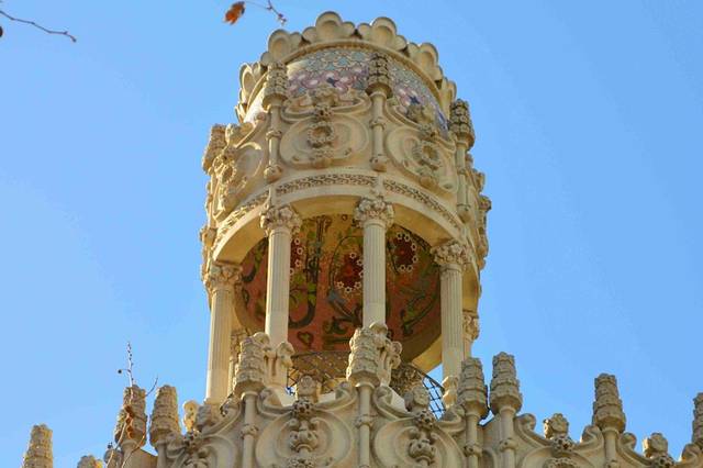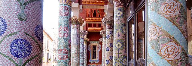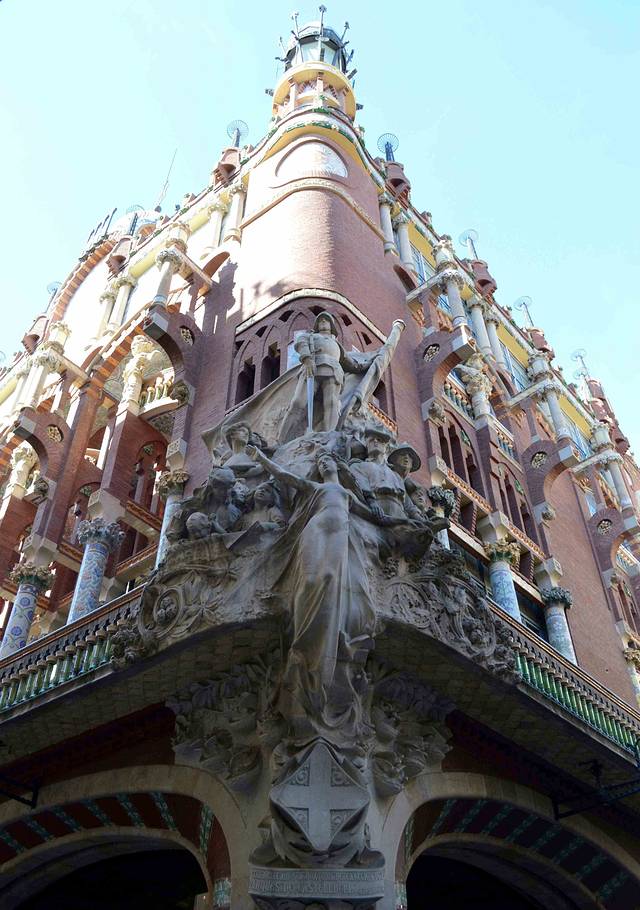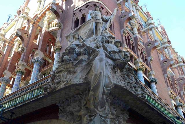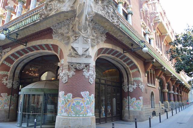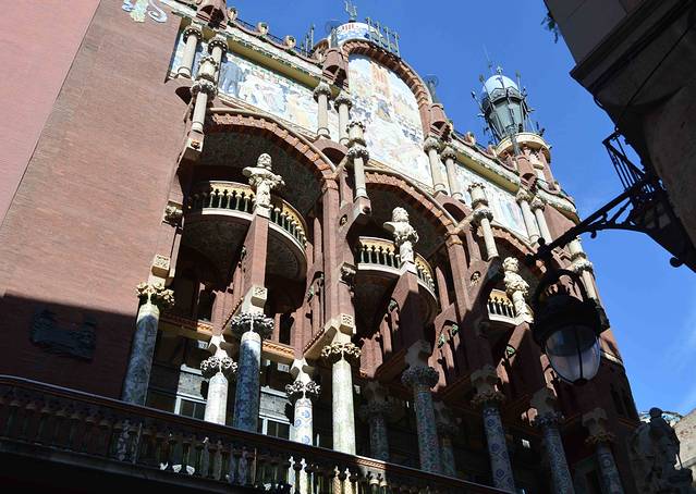 加泰罗尼亚音乐宫坐落在狭窄的街道,立面装饰丰富,而且结合了多种元素,包括传统的西班牙元素和阿拉伯元素。