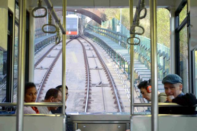 我不知道这个就是地铁站,跟着大家走进去咯,啊,原来这才是登山缆车喔,遗憾进门时没拍照,于是对着墙上的老照片“咔嚓”一下。反正一百多年了来还是这个样。巴士,缆车都用10次票,挺方便的。