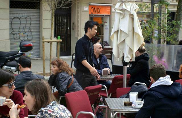 在高迪大道上,有许多餐厅咖啡馆把桌子放在路中间,看到一位帅哥在服务,像是同胞,赞赏年轻人自食其力的做法。