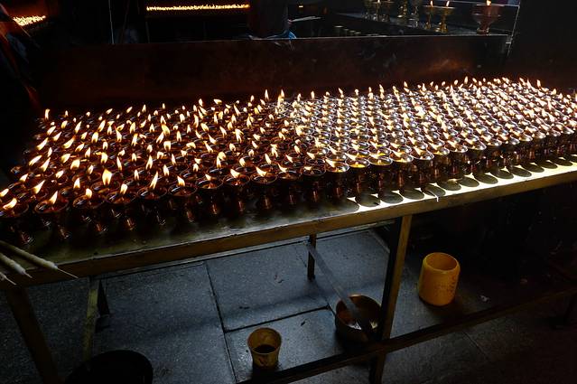 进入佛堂后一定记住按顺时针方向参观,不可以戴帽子或墨镜,但可以带口罩。因为藏传佛教每个佛殿中供的佛像都很多,所以常会有信众在门口拿一大叠一毛的纸币跟大家换零钱。