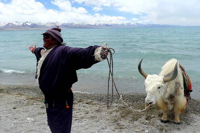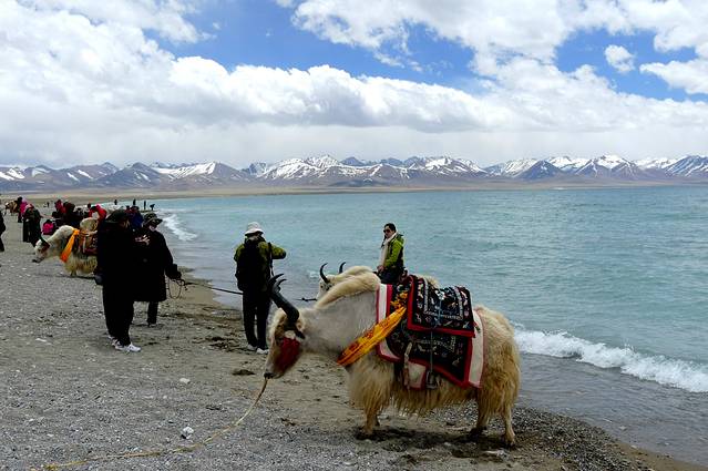 湖边有很多当地人牵着牦牛和马来与游客合影。