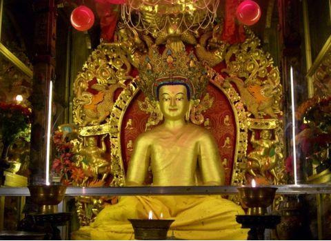 大昭寺最早的建筑都从正门开始;外院是后来修建、扩充的,而主殿是1400多年前的建筑。由于多年来信徒的摩擦,门口的石头地板光亮如镜。大殿左右各有一尊巨大的佛像。左侧为红教创始人密宗大师莲花生,他本来是印度的佛学家,公元八世纪进藏,在他入藏以后藏区开始出现密宗。右侧是未来佛弥勒佛(藏称强巴佛)。