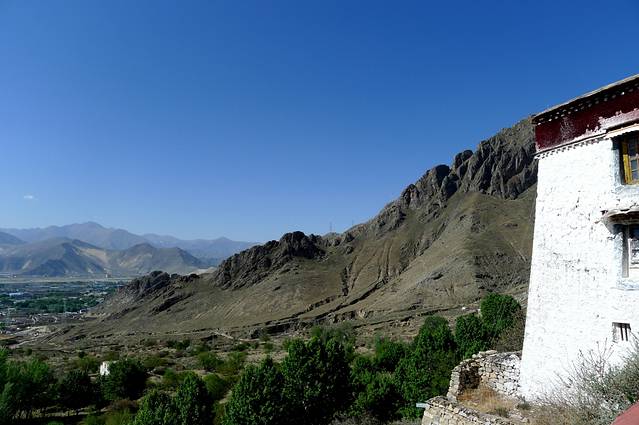 白居寺就在宗山城堡不远处。在山门前,可以清晰地看到宗山城堡周围的“长城”,以及白居寺巨大的晒佛台。