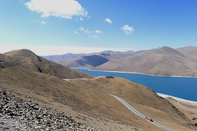 接着,我们又在盘山公路上行驶了一段时间,一路向山下行进,终于到达羊湖的观景台。羊湖的实际高度是4441米。