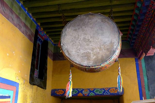 白宫的参观路线从德央夏,也就是东庭院进门。门口有两面巨大的马皮鼓,每天在拉萨时间早上7点和晚上9点就会敲响,晚上击鼓后布达拉宫就不能再随意走动和喧哗。