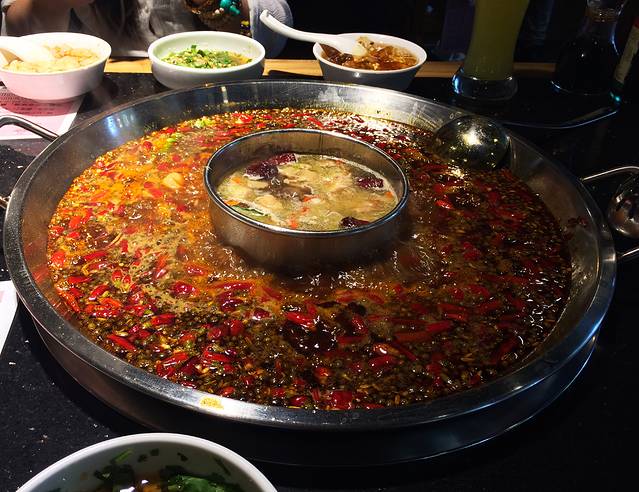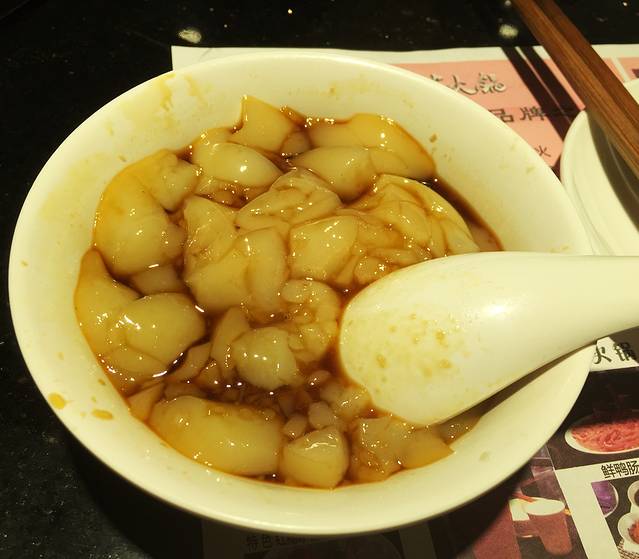 火锅是必吃的,虽然住宿酒店门口就有两家装潢很像那么回事儿的,但都是外地人来开的针对游客的。然后比较有名的蜀九香连锁,吃的就是个高档,大约人均二百起,据说是普通火锅的两三倍。有个打车师傅说贵却不地道,于是推荐我去一家老火锅店叫老味火锅,于是我们去了西安南路,有很多当地人会选择吃饭的一条街。很可惜我们最后没有找到这家,地图中也没有显示,看来是真老不够商业的一家店吧。于是觉得既然如此天太热尽量选个环境可以的,进了一家老阿婆,也是连锁的,吃货好奇心作祟点了猪脑鸭肠鸭血和猪大肠,没想到上来竟是这么血腥的,汗!我们调料什么都不会吃,问了隔壁桌当地的一家三口,终于碰到热情的了,很耐心教我们怎么吃,还担心我们吃不好经常插嘴教育,并声称他们也觉得这家店有点辣呢,让我点凉粉凉糕搭,么么哒!红锅真心辣呀,我在北方算比较能吃辣的,吃完这家红锅胃里火烧火燎一整天。喜欢红糖凉粉和凉糕,不同味都好吃,强烈推荐!点的都是肉最后撑得不行剩下些豆腐素菜啥的还点了鲜榨果汁和甜品俩人消费200,跟在济南吃个涮羊肉差不多,给个赞!成都整体消费跟济南完全是同一水平,无需脑补。