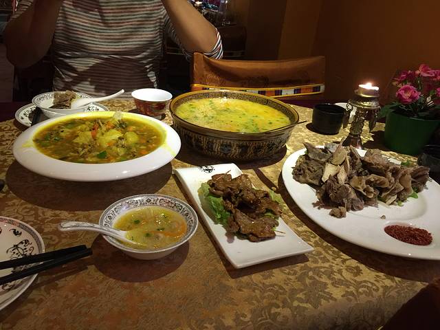 九寨沟餐饮跟景区就不在一个level上了,很差非常差。因朋友推荐我们去了离酒店只几步路的阿布氇孜藏餐,门头非常小,因为店面在二楼所以要注意看不要走过了。据司机师傅说这家藏餐有价无实,主要接待外宾的。我们去时的确有一家外宾似乎被全程接待一样,吃饭只有我们一桌。牛羊肉份量都很小,酥油茶一小壶就58,但我很喜欢腥味奶味都比较重。藏面比较推荐配肉吃很清口量也超大几乎就是一锅汤。阿玛拉做土豆看大众点评很多人推荐就点了,有点咖喱的味道,整体我们有些吃不惯都没有吃,不过当地土豆口感是很特别有点像芋头,所以建议大家尝试其他土豆的菜品。吃完饭店长还亲自为我们唱祝酒歌献哈达,氛围不错,已经是九寨最好最有特色的一家了,来都来了还是力荐要尝尝这家的。阿布氇孜藏餐人均200左右。