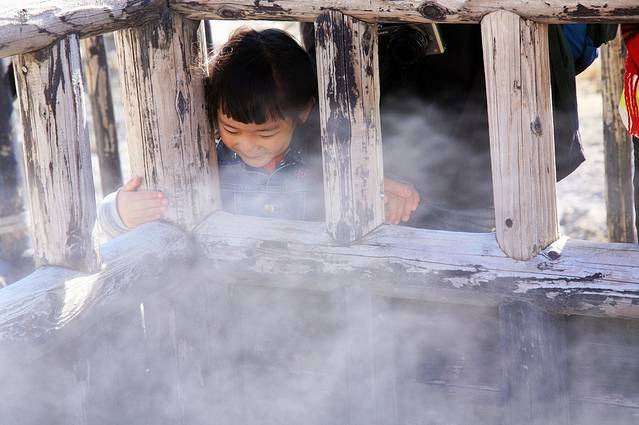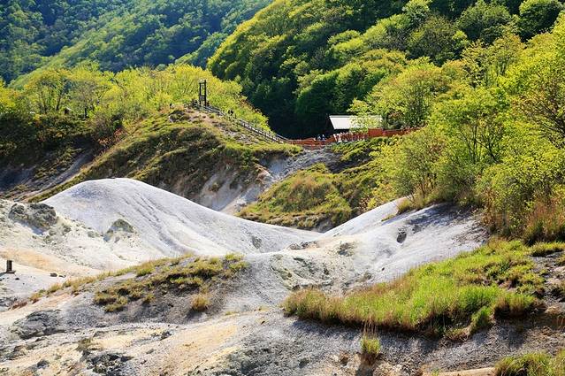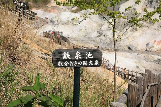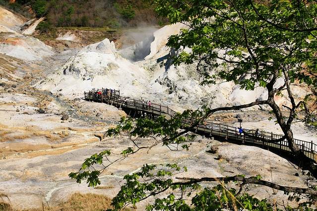 如果要去泡登别的温泉,就一定会去地狱谷。从札幌的新千岁机场到登别地狱谷约80公里的路程,大巴行驶时间约1个半小时。登别位于北海道西南部,登别温泉是北海道有代表性的温泉。其中最特别的是地狱谷,火山气体从灰黄色的岩石表面向外喷出,周围空气中充满了浓烈的硫磺异味,很像是一幅地狱中的景象。山谷是直径为450米的爆裂火口,温泉的出水量每分钟高达3000立升。它是火山爆发后,由融岩所形成的一个奇形诡异的谷地。沿着谷地的栈道,有一个铁泉池,里面的温泉水会间隙性的爆发,蛮有意思的。